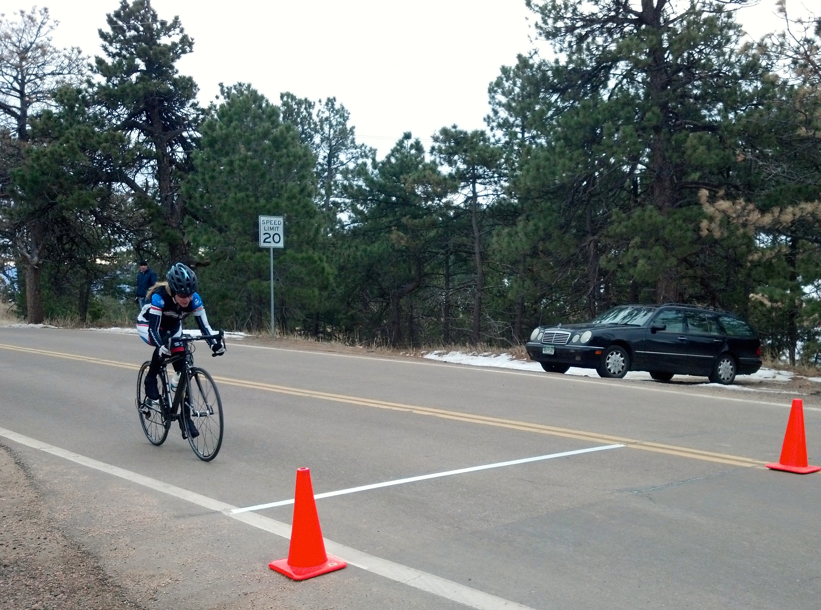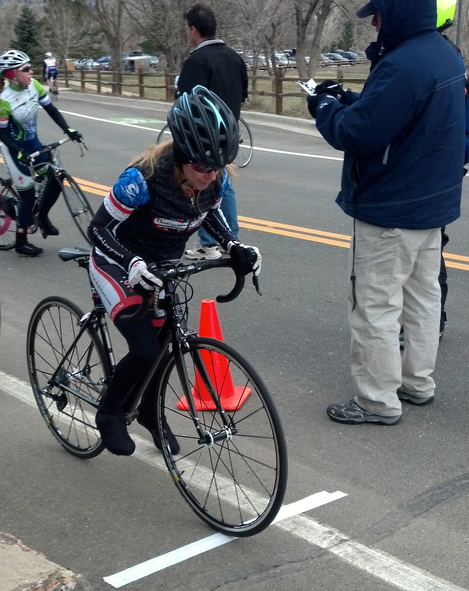 It was a crisp Sunday morning and I intentionally had not pre-registered for the criterium race because of Colorado’s notorious winter-like weather conditions in the Spring. It had been only 26 degrees and snowing the day before! I arrived early at the Stazio Baseball Fields for the University of Colorado Stazio Criterium. I sat and watched some of the collegiate races as the sun continued to burn off the crisp morning air. I was exchanging text messages with a teammate and soon concluded that if I did register for the race, I’d be the lone representative in the peloton from my team. I finally decided to end the procrastination and registered for the race.